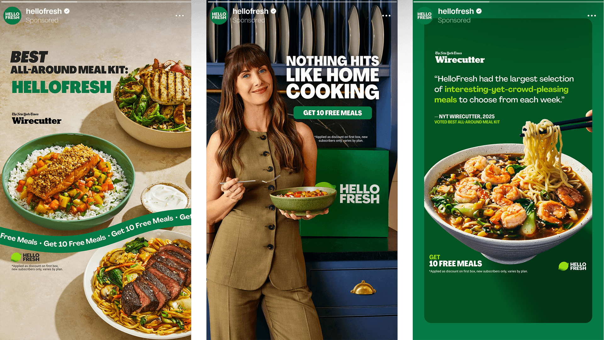Working on HelloFresh’s Paid Social and Performance Innovation team means constantly concepting, designing, working with AI, and producing a high volume of ad variations across multiple brands. With briefs tailored to different audiences across brands like HelloFresh, Factor, Green Chef, and more, I've created an average of 50+ assets each week. While our core output leans into UGC-style visuals (often from in-house shoots that I art direct, prop, and style), I also develop more polished, elevated designs that work. Below are a selection of those higher-gloss assets with a few UGC -- which not only aligned with each brand’s aesthetic but also drove stronger performance, with lower CAC and higher customer acquisition. <3 Sr. Copywriter: Elly Ayres