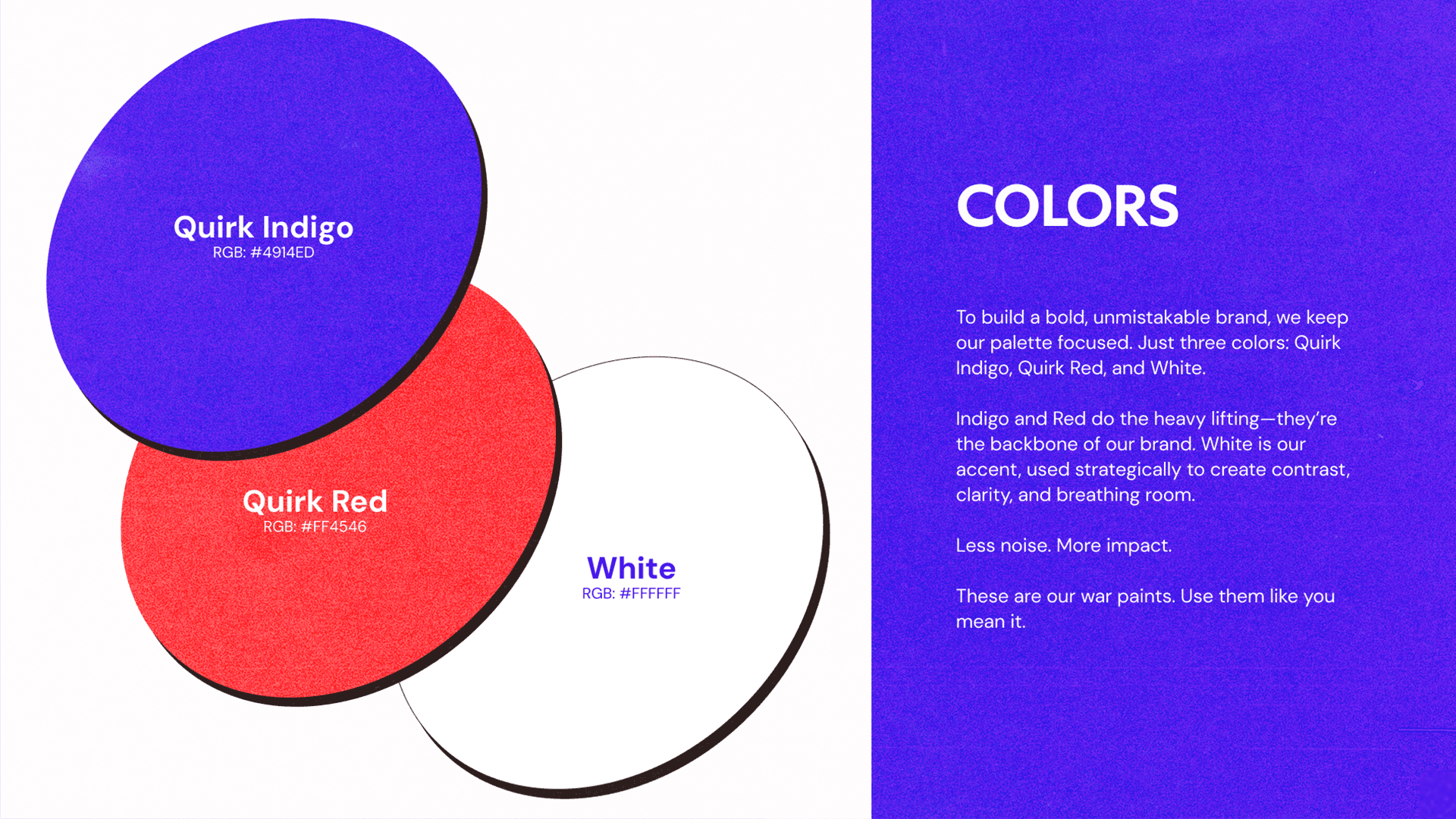 Quirk Creative came with a built-in creative brief: the name. An agency called Quirk can't look like everyone els... it has to earn it. As the lead on this internal rebrand, I set out to build a system that could compete for higher-caliber clients without losing the personality that made Quirk, Quirk. I retained the original red but pushed it somewhere more electric. The introduced color of Quirk Indigo became a metaphor of the sky: expansive, electric, full of possibility. The red oval, borrowed from the dot in the "i" and period in Quirk, represents itself as the brands signature stamp. The result is a visual identity that finally looks as bold as the agency behind it.